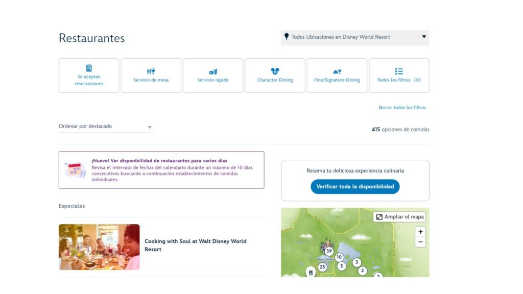 Descubre cómo encontrar y reservar mesa en Disney World y Disneyland para hasta 10 días seguidos, explora filtros avanzados y ahorra tiempo en tu planificación.